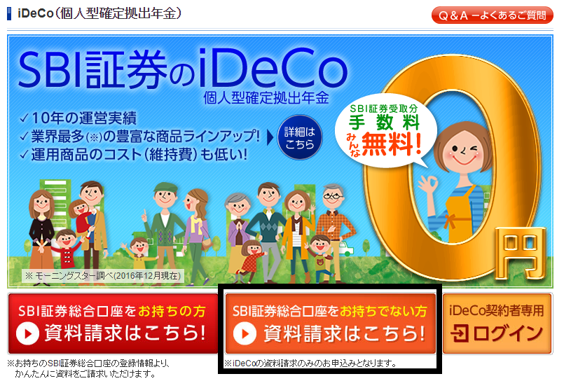 SBI証券の口座を持っていない人は、選択画面に従って資料請求を行います。※すでにSBIの口座をお持ちの方は左のバナーをクリックしてください。